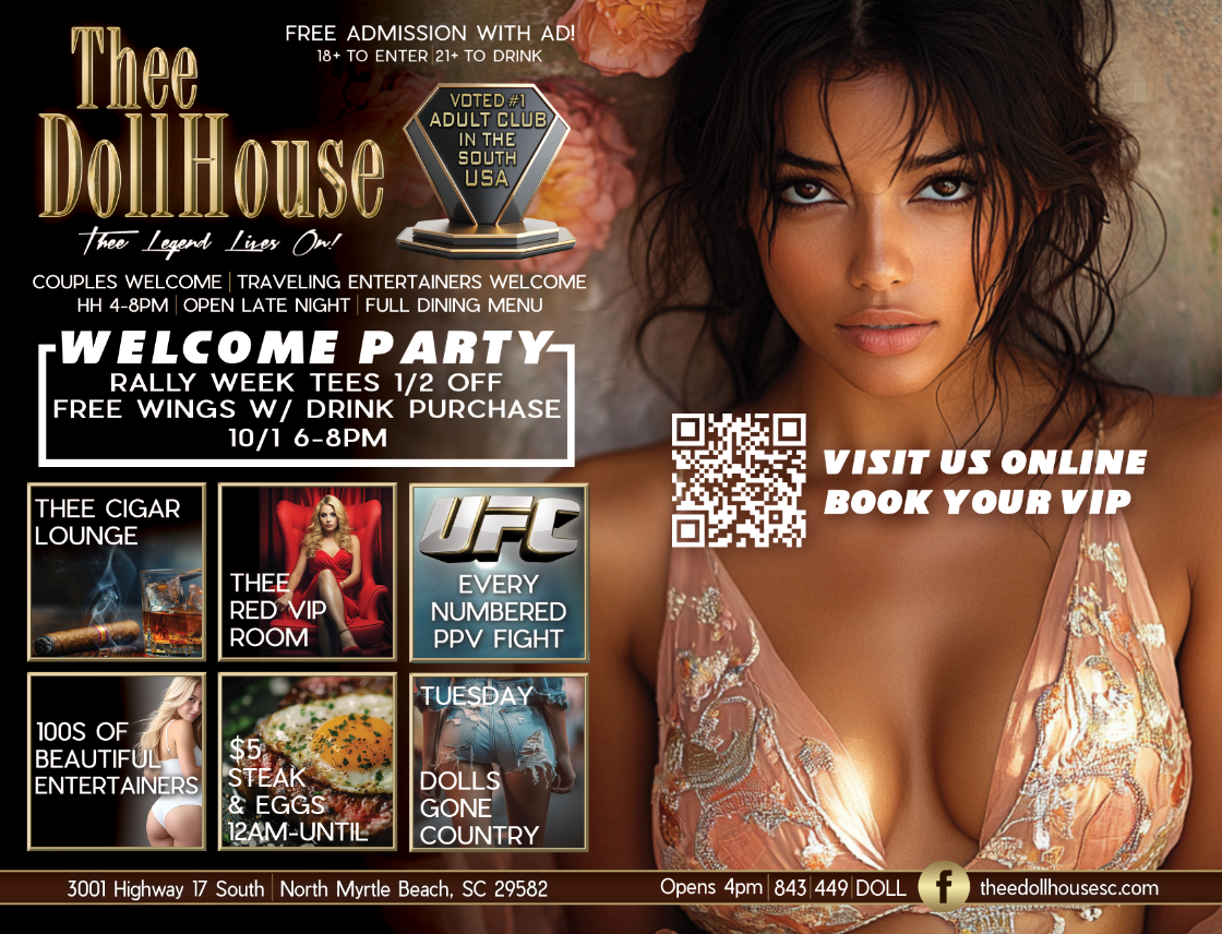 Myrtle Beach, the party is officially on! Join us at Thee Dollhouse, the South’s #1 Adult Club, as we kick off Rally Week in true Dollhouse style with our Welcome Party on October 1st from 6–8PM.